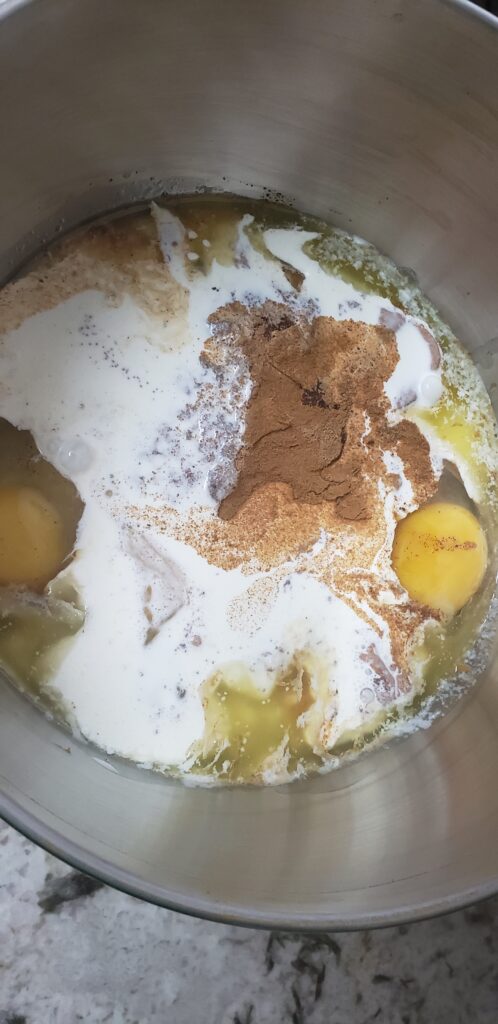 3. Add potatoes, sugar, eggs, cinnamon, nutmeg, butter, milk,vanilla, extract to a large bowl.