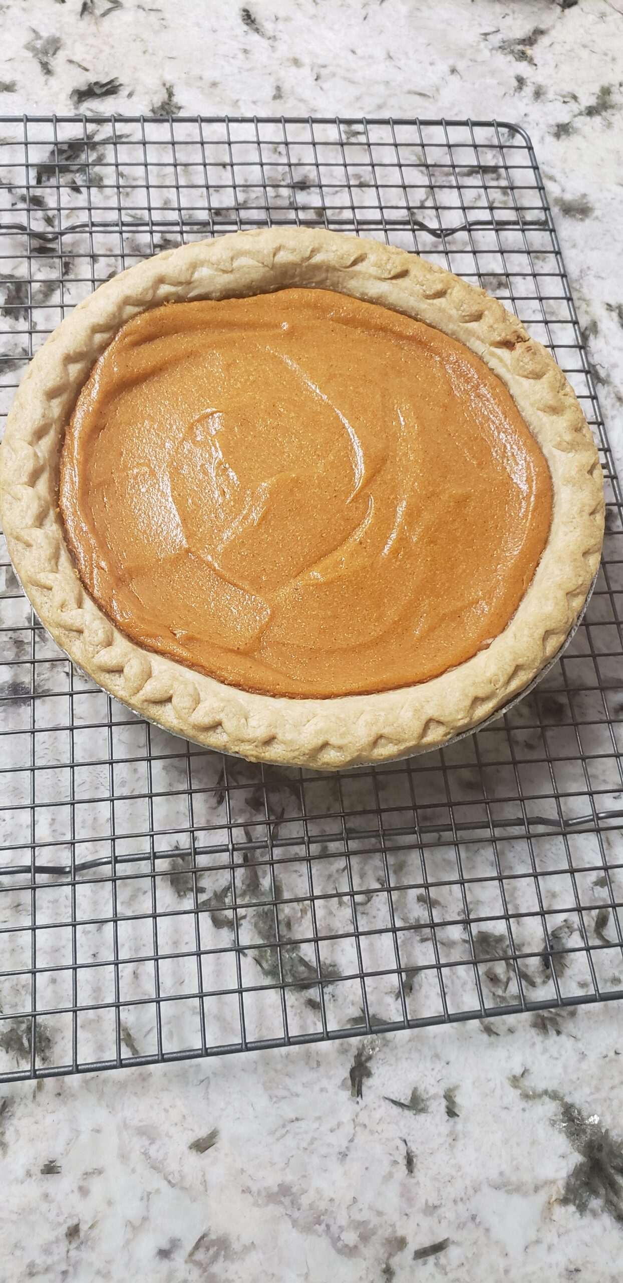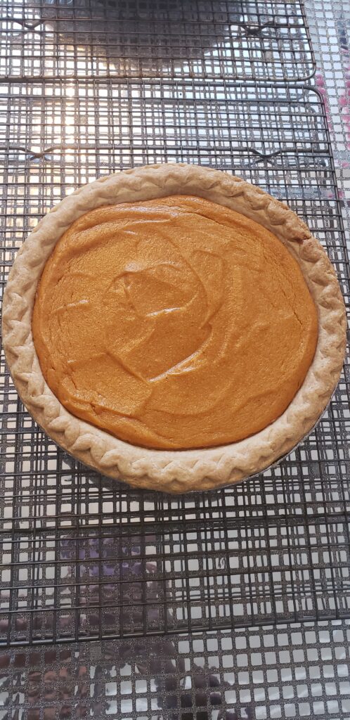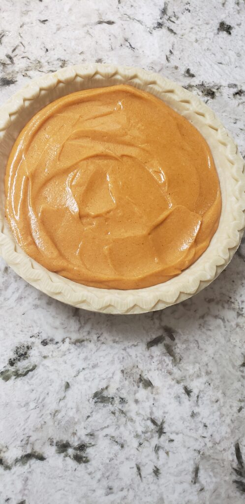 “Pour into a pre-baked pie crust and bake at 350°F for 45 minutes.”